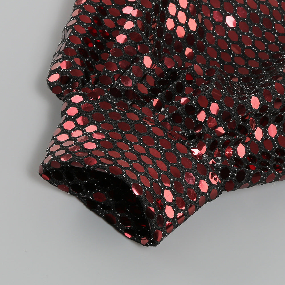 De éénschouderstijl en het nauwsluitende silhouet accentueren je figuur op verfijnde wijze, terwijl de sprankelende pailletten bij elke beweging het licht vangen. Gemaakt van comfortabele spandexstof met subtiele stretch, zodat je vrij kunt bewegen zonder in te leveren op stijl.